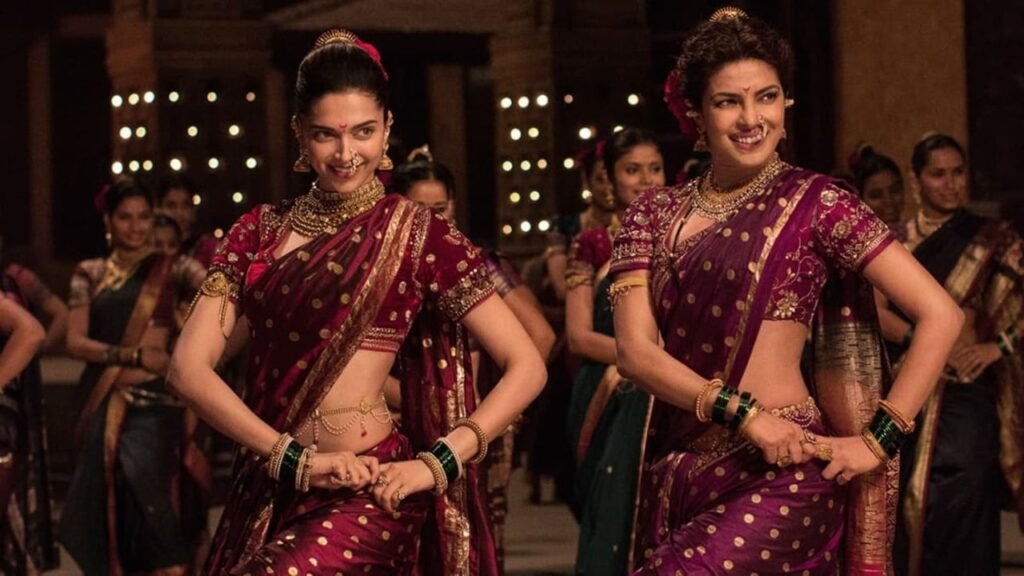 No list of iconic Nauvari saree looks is complete without mentioning Bajirao Mastani. Priyanka Chopra, as Kashibai, epitomized understated elegance, while Deepika Padukone’s Pinga dance look became iconic overnight. Deepika’s deep maroon Paithani with golden polka dots perfectly captured traditional grandeur, whereas Priyanka’s softer tones made her look poised and graceful. If you’re aiming to blend drama with sophistication this Ganesh Chaturthi, these two looks are timeless inspirations. Both actresses prove that the right drape paired with matching accessories can turn any saree into a statement piece.