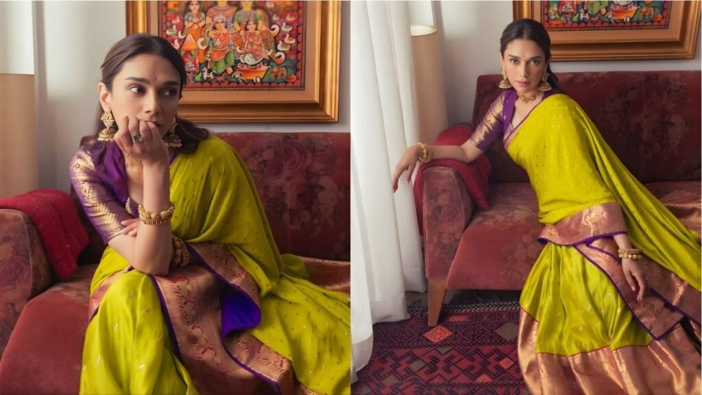 The Aditi Rao Hydari Kanjeevaram lehenga is rendered in a luminous chartreuse with a rich purple border — a colour combination that feels both ancient and arrestingly fresh.