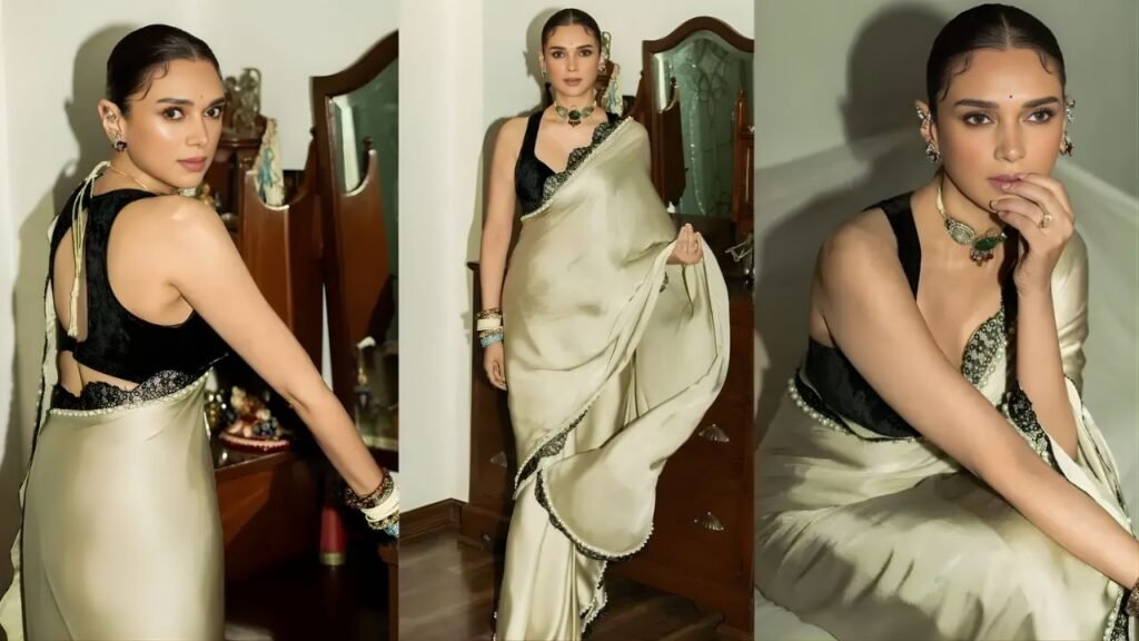 Aditi Rao Hydari once again proved why she is one of the most graceful fashion icons of the industry. Ahead of her appearance at an award ceremony, the actress chose a custom cream silk saree by Manish Malhotra, pairing it with a contrasting black blouse, creating a look that was minimalistic yet irresistibly elegant.