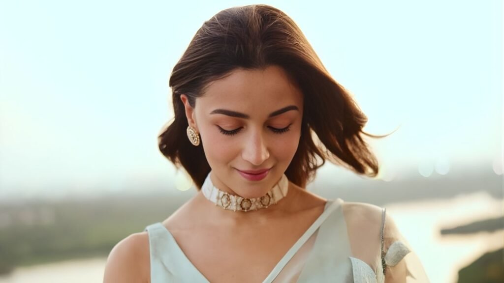 A closer look at Alia’s styling reveals careful attention to detail. Her hair was styled in loose, centre-parted waves, framing her face and enhancing the softness of the overall look. The makeup remained subtle, focusing on natural tones with defined eyes and a gentle glow.