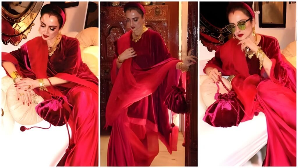 True to her maximalist sensibility, Rekha completed the look with antique gold jewellery — stacked bangles, bold necklaces, and statement pieces that enhanced rather than competed. A velvet potli echoed the colour palette, while oversized tinted sunglasses and a plush headband introduced a subtle 70s-inspired flair. Her signature sindoor, glowing skin, arched brows, and bold red lip tied the look together with unmistakable Rekha glamour.