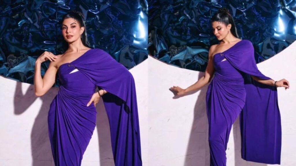 Jacqueline Fernandez wore a one-shoulder drape gown by Shantanu & Nikhil, priced at ₹48,500, that embodied the designers’ signature language of sculptural minimalism and fluid form. The gown featured an asymmetrical neckline with a cape-like drape cascading from one shoulder, creating movement without overwhelming the silhouette.