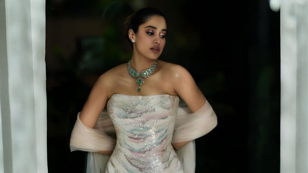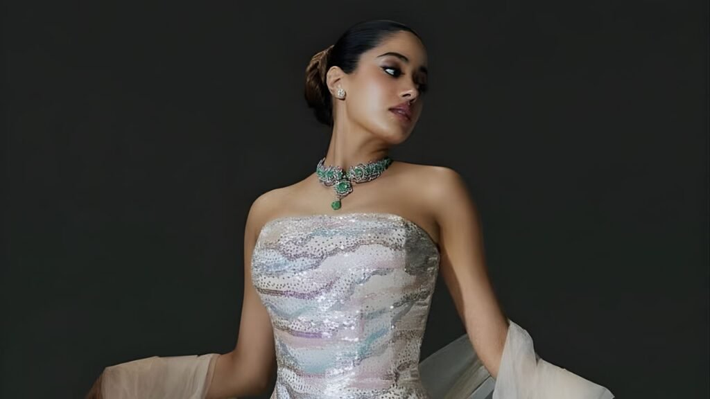 At first glance, the strapless gown appeared almost minimalist. Designed in a sleek column silhouette, it traced Janhvi’s frame with architectural precision, falling straight to the floor without flares, ruffles, or exaggerated volume. The body-hugging cut elongated her figure, creating a statuesque line that felt both modern and commanding.