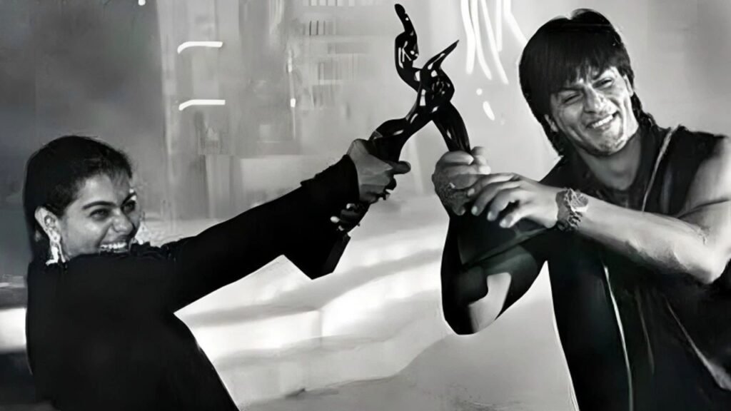 Later that night, Kajol took the nostalgia to another level by sharing a then-and-now post on Instagram. The photo featured a vintage shot of her and Shah Rukh holding their Filmfare trophies years ago — mirrored perfectly by their 2025 moment holding new “black ladies.”