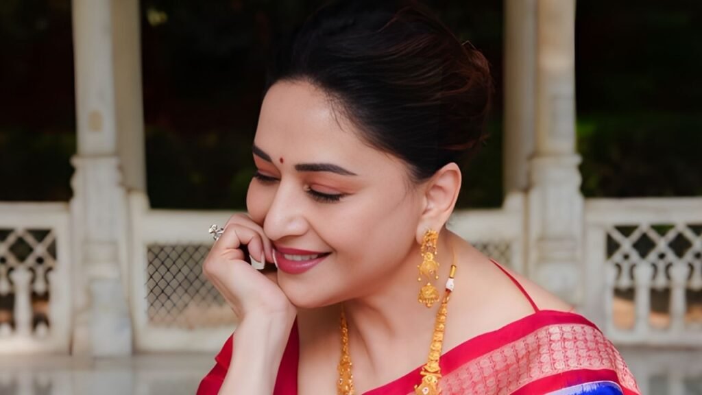 Madhuri’s styling choices elevated the saree beyond a simple outfit reveal. The fuchsia silk blouse mirrored the border, creating a cohesive visual flow. Its classic cut—round neckline and elbow-length sleeves—ensured that the focus remained on the weave rather than experimental tailoring.