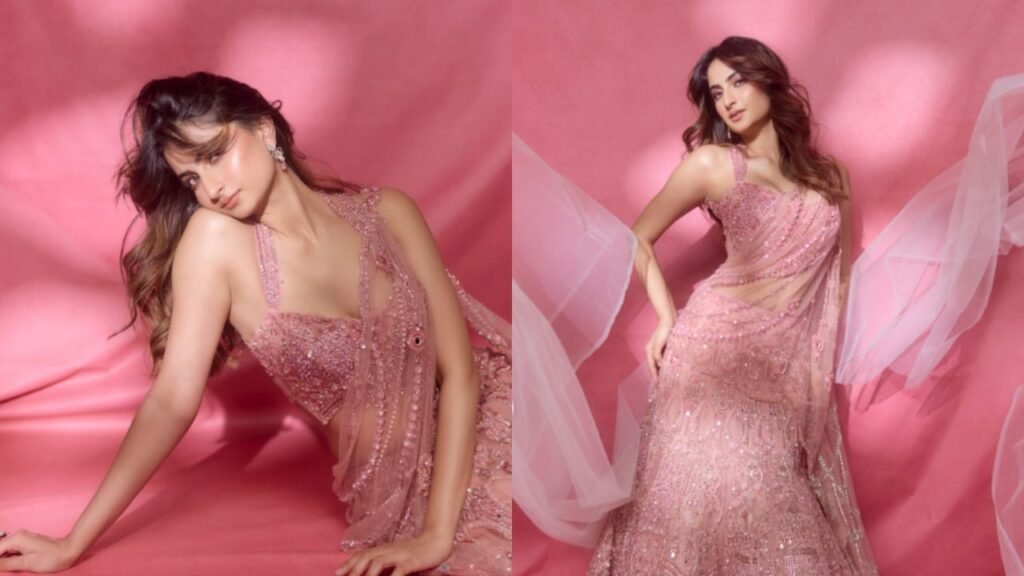 In a series of pictures shared on Instagram, Palak posed with Etude India’s newly launched lip tint, exuding Barbie-core elegance. She was seen wearing a heavily embellished pink net saree in a vibrant, festive hue. The sheer fabric was adorned with intricate beadwork and sequinned detailing, lending the outfit an ethereal and luminous charm.