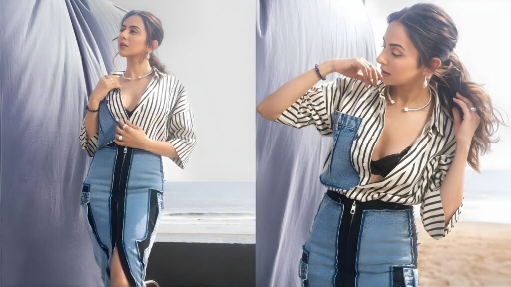 Rakul’s outfit featured a white striped shirt with a striking denim patch pocket, styled partially unbuttoned to reveal a lace bralette that added subtle allure. The look was completed with a high-waisted denim pencil skirt, accentuated by a sleek front zipper and side pockets — giving the outfit a structured, powerful silhouette.