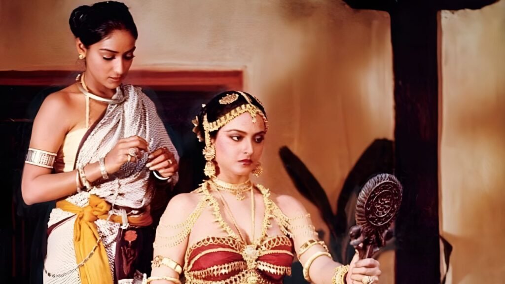 Rekha’s fierce transformation from a betrayed woman to an unstoppable avenger earned her a Filmfare Award for Best Actress. The role highlighted her ability to combine strength and beauty in a single frame, making it one of her most memorable performances. Her determination and intensity inspired a generation of female-led action films. Aarti/Jyoti remains an iconic symbol of revenge and empowerment.