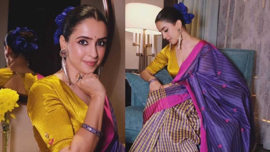 In the newly shared images, Sanya captivates in a rich, dual-toned purple-and-pink saree paired with a glowing mustard-gold blouse. The contrast of vibrant hues highlights her natural beauty, making her look nothing short of radiant.