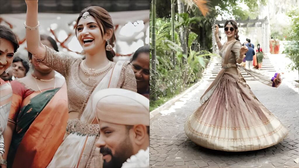 South Indian actress Sreeleela once again proved why she’s a modern-day fashion icon as she attended the wedding of cinematographer Bhuvan Gowda and Nikitha. The actress graced the celebration in a stunning custom Kanjeevaram half saree designed by Bhargavi Kunam, radiating grace, tradition, and youthful charm in every frame.