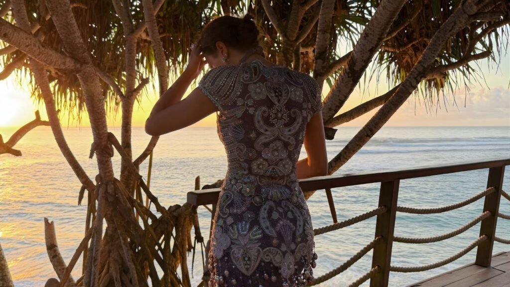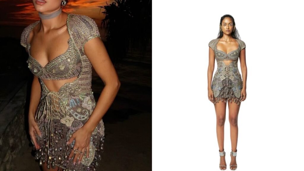 The outfit immediately caught attention for its refined aesthetic and delicate detailing. It was not just a party look—it was a carefully curated style moment that balanced glamour with sophistication.