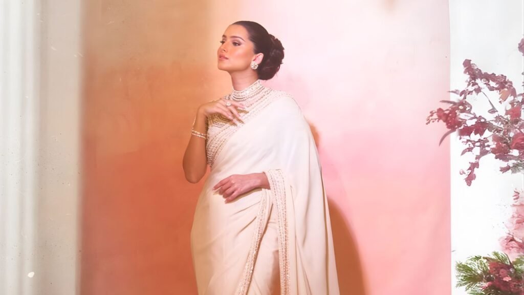 Tara was seen draped in a pearl-embellished ivory saree by Tarun Tahiliani, a designer synonymous with refined Indian couture. The six yards of fluid elegance highlighted her graceful silhouette, while the delicately embellished borders added depth and richness without overpowering the look. The saree stood as a testament to timeless craftsmanship, proving that minimalism, when executed right, can be profoundly impactful.